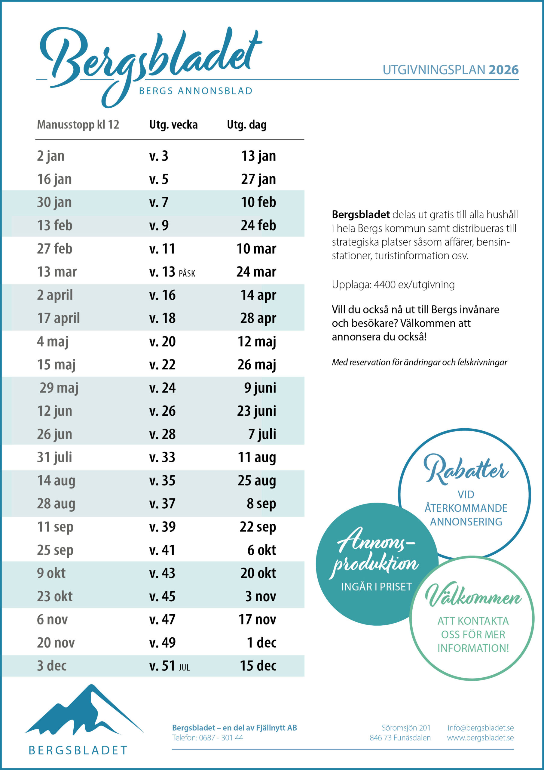 Postnord sköter distribueringen till alla hushåll i Bergs kommun, 4400 st (2025). Alla skrivna och bosatta i kommunen får Bergsbladet i sin brevlåda. Även om man valt “Ej reklam”. Dessutom delas Bergsbladet ut på ett flertal strategiska platser runt om i landskapet.